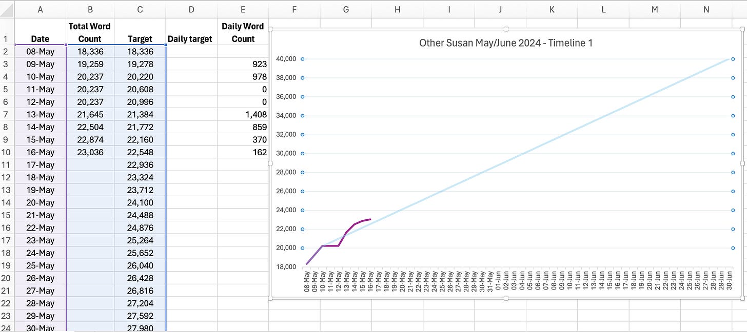 So what to do? I told myself it was OK and it was my deadline so I could extend it. I extended it to the end of June, which I calculated was only about 390 words a day. That seems doable, and now my purple line is wandering above the blue line quite happily. I like to see that I’m ahead of myself, I find that far more motivating. And I know if I miss a day I can easily catch up.